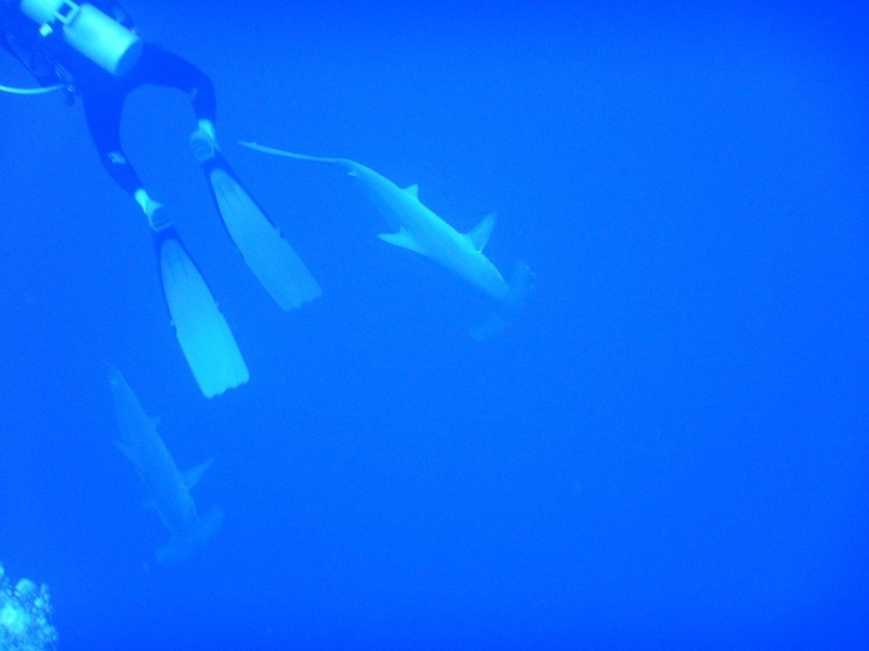 Après quelques longimanus curieux apercus la veille, notre premier objectif était atteint, non sans une certaine appréhension. Car ces petites betes sont tout de même impressionnantes et les plongées demandent le respect d’essentielles règles de sécurité. Le jour suivant, suspens….les requins marteaux seront-ils au rendez-vous ? Rien de moins evident. Le risque est toujours là de rentrer bredouille après avoir patienté dans le bleu à scruter la moindre ombre au loin. Le matin une pointe de déception, mais une magnifique manta aperçue en surface depuis les 20 mètres. La seconde plongée, miracle, notre guide les repère en dessous des 35 mètres. Ils remontent en spirale à notre rencontre. Un beau groupe d’une vingtaine d’individus. Ils arrivent à notre hauteur en tournant autour de la grappe de plongeurs. On en reste bouche bée. Quand est-ce qu’on y retourne ?